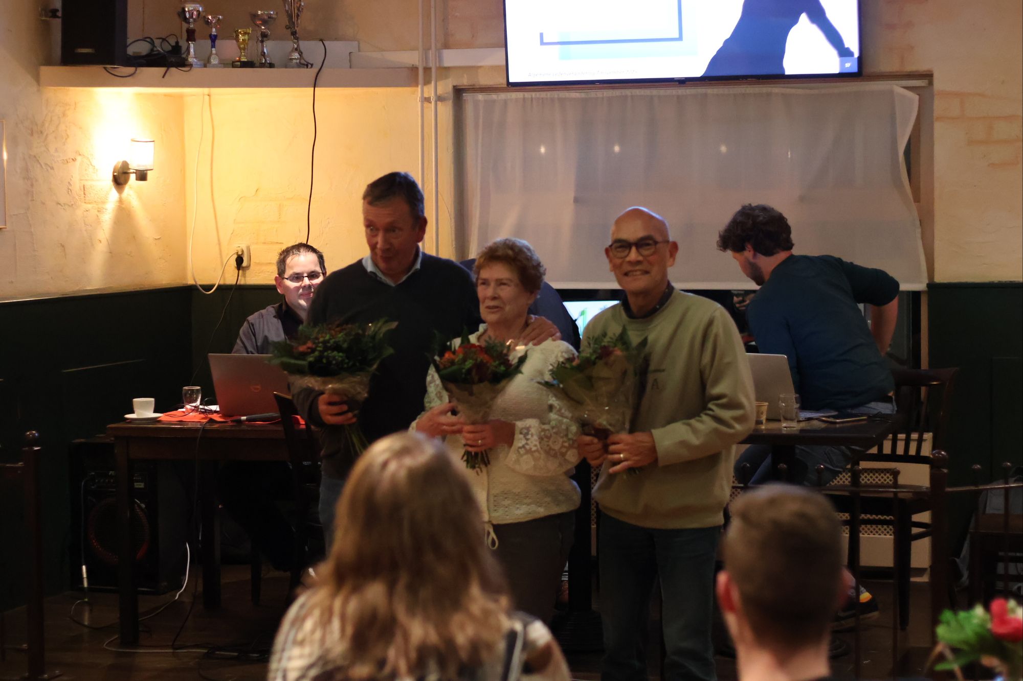 Financieel gaat het ook allemaal prima. Over het afgelopen handbaljaar kon penningmeester Christ van den Hout zelfs een klein plusje presenteren. Wel gaat de contributie voor actieve leden vanaf volgend seizoen iets omhoog. Dat heeft te maken met gestegen kosten, onder andere van het bondslidmaatschap, die we moeten doorberekenen. Daar stemde de vergadering zonder al te veel misbaar mee in. Ook waren er bloemen, veel bloemen. Voor de jubilarissen. Ook daar kon iedereen mee leven. Sterker nog; een hartelijk applaus viel deze trouwe clubmensen ten deel.