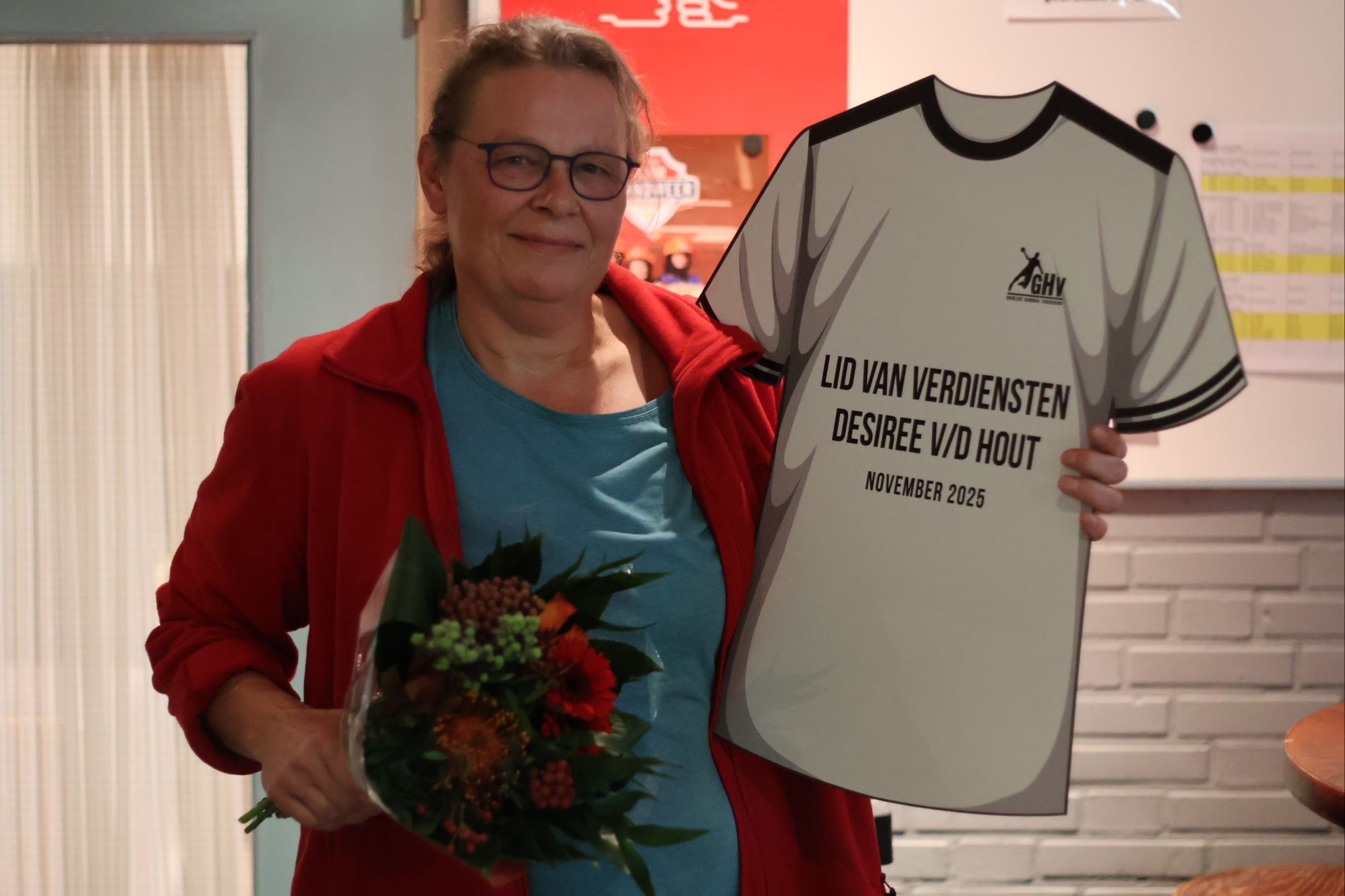 Iedereen die Desiree en GHV ook maar een béétje kent, zal de uitverkiezing terecht vinden. Ze is de olie in de motor van GHV. Het cement tussen de stenen en zo kunnen we er nog wel meer metaforen op loslaten. We vermoeden soms dat wanneer we onder een tribune kijken, daar een bed staat waar Desiree soms overnacht. Zó vaak is ze op de club en zó veel uren maakt ze, natuurlijk geheel belangeloos. Dat doet ze al sinds 1982, al is ze er wel even tussenuit geweest. Ze draaide bardiensten, gaf trainingen, zat in de scheidsrechterscommissie, is al lang wedstrijdsecretaris en nog veel meer. Ze is een beetje de moeder van GHV. Van harte gefeliciteerd, Desiree!